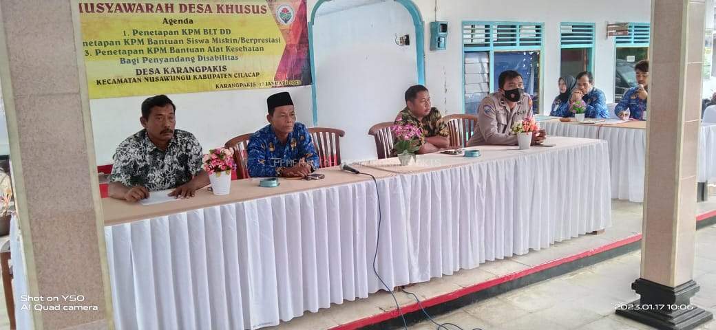 Penggunaan Dana Desa diatur dalam PMK nomor 201/PMK.07/2022 tentang pengelolaan Dana Desa, dimana program pemulihan ekonomi berupa perlindungan sosial dan penanganan kemiskinan ekstrem dalam bentuk BLT desa merupakan kegiatan prioritas. Pemerintah Desa Karangpakis menyelenggarakan Musyawarah Desa Khusus dalam menetapkan KPM BLT DD Tahun Anggaran 2023.
